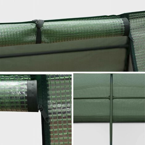 L’aération est importante pour les plantes, la serre est donc équipée d’une grande fenêtre pour réguler sa température. La serre a une toile en polyéthylène de 135g/m² souple et résistant. Les parois ont un débord de film à enfouir sous la terre pour maintenir la serre. La structure est en acier recouvert de peinture époxy qui retarde l’apparition des traces de corrosion.