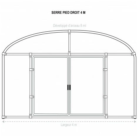 Cette serre tunnel pieds droits largeur 4m est disponible en plusieurs longueurs : de 4.5 m à 12 m. Ses pieds droits vous permettent de cultiver au plus près des parois. L’espacement entre les arceaux est de 1.50 m pour plus de solidité au sol.
