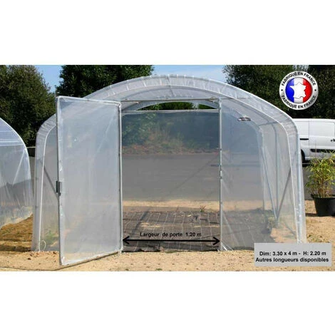 Elle offre une largeur au sol de 3,30 m et une hauteur de 2,20 m. Chaque élément de la serre a été choisi pour ses qualités et sa durée de vie : bâches, garanties 5 ans, clips en inox, fil Deltane, arceaux en 40 mm.