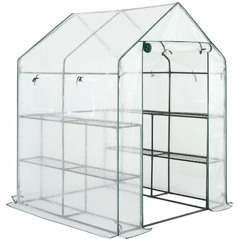 À l’intérieur de la serre avec bâche se trouvent 2 étagères enfichables avec 4 surfaces de rangement par étagère offrant beaucoup de place pour les plantes. Chaque étagère peut supporter un poids max. de 10 kg.