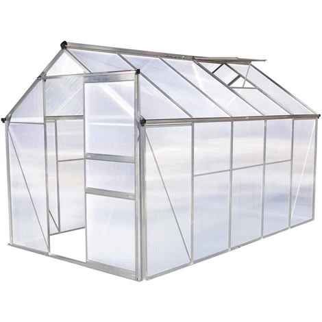 Serre de jardin polycarbonate « Hortensia » de couleur transparente couleur Argenté- Structure haute qualité en aluminium – Dimensions hors tout : 190(l)x312(L)x193(H)cm – Façade de panneaux doubles 4mm – Une porte simple et une lucarne – (embase métallique non inclue)Serre jardin polycarbonate « Hortensia »
