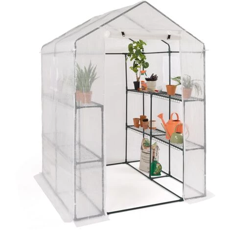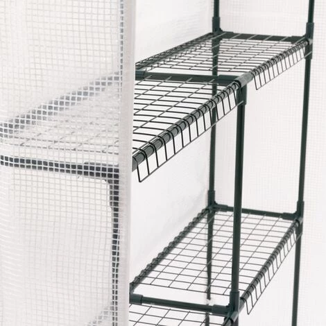 Descriptif de la serre de jardin 8 étagères avec 2 fenêtresGrâce à cette serre de jardin, d’une hauteur de 200 CM et ses 8 étagères très pratiques, optimisez le rangement et l’entretien de vos plantes durant toutes les saisons. Sa grande surface de stockage vous permet d’entreposer et de protéger toutes vos plantes jusqu’à 200 cm de hauteur maximum, sans monopoliser votre jardin ! En effet, cette serre de 140 CM de côté s’installe facilement dans n’importe quel jardin, petit ou grand.Composée d’une structure et d’étagères en acier, vous n’aurez pas à vous soucier ni de la stabilité de la serre de jardin, ni de sa robustesse. Aucune crainte à avoir pour vos plantes ! Ses étagères grillagées permettent non seulement d’y stocker de nombreuses plantes sans risquer de s’affaisser, mais aussi tout le petit matériel nécessaire à l’entretien de vos plantes. Sécateurs, râteaux à main, truelles ou encore sacs de terre y sont donc les bienvenus.Une bâche épaisse en PE de 140g/m² vient s’installer sur la structure, et créer le climat parfait pour les plantes installées dans la serre. Toutes vos cultures y seront à leur aise, tant en été qu’en hiver où elles seront à l’abri du froid ! Vous trouvez cela dur à croire? Une jupe en continuité de la bâche permet d’encrer la serre au sol, évitant tous les courants d’air ou autres insectes malvenus qui tenteraient de s’inviter par le dessous.Equipée de 2 fenêtres de 30×30 CM avec moustiquaires, vous pourrez aérer vos plantes grâce à ces ouvertures sans craindre qu’elles soient envahis de nuisibles. Vous pourrez tout aussi bien décider de les protéger au maximum en les refermant.La serre dispose également d’une grande porte de 75×170 CM afin de vous permettre de faire rentrer facilement vos plantes à l’intérieur et d’y accéder en toute simplicité.Dimensions de la serre de jardin 8 étagèresDimensions de la serre : Longueur 140 CM x largeur 140 CM x Hauteur 200 CMDimensions d’une étagère : Longueur 58 CM x largeur 28 CM x Hauteur 48 CMBâche transparente en PE 140g/m²Structure en tubes d’acier et connecteurs plastiquesDiamètres des tubes : 16mm2 fenêtres de 30 x 30 CM1 porte de 75 x 170 CMRetrouvez toutes nos serres de jardin sur notre boutique en ligne !