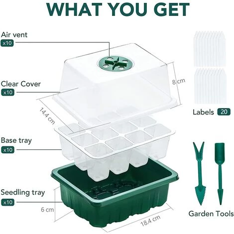 Compatible avec tapis chauffant et lampe végétale : Peut être utilisé longtemps à une température inférieure à 48°C. Une excellente façon de promouvoir un jardin beau et sain. Le propagateur est livré avec 20 étiquettes de plantes et 2 petits outils de jardinage. Une bonne aide pour planter et faire pousser des semis.