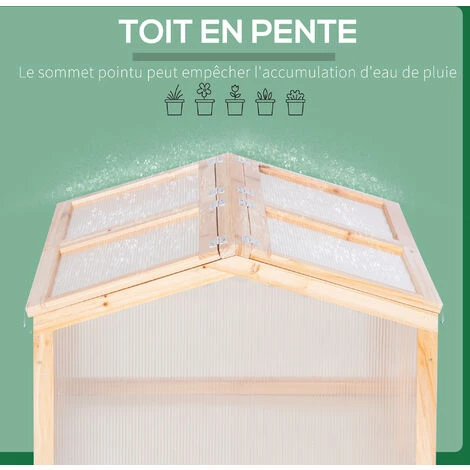Cette jolie mini serre de jardin avec double toit ouvrable 2 niveaux suivant vos besoins vous permettra de protéger vos plantes, légumes, etc. durant l’hiver et le printemps. Sa conception et fabrication en bois de sapin pré-huilé et panneaux de polycarbonate vous assureront protection et rendement.