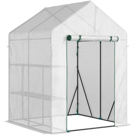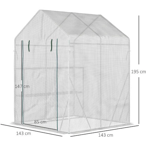 Cette superbe serre de jardin protègera efficacement vos plantes afin d’en tirer le meilleur rendement possible. Equipée de 2 grandes tablettes, d’une porte déroulante zippée avec boucles d’attache, d’une structure en acier thermo-laqué, et d’une bâche rallongée en PE haute densité 140 g/m², vous pourrez sereinement lancer votre nouvelle production agricole. Caracteristiques : – Serre de jardin idéale pour protéger vos plantes contre le froid, la pluie, les insectes, oiseaux, etc. – Espace supplémentaire très pratique grâce à 2 grandes étagères latérales de culture en métal – Bâche en polyéthylène imperméable anti-UV haute densité 140 g/m² rallongée de 10 cm pour un meilleur maintien au sol (cordons de serrage à la structure inclus) – Porte enroulable avec zip et boucles d’attache afin de vous adapter parfaitement aux conditions climatiques – Structure châssis en acier thermo-laqué pour un usage pérenne – 4 cordons de serrage et 4 piquets d’ancrage au sol inclus – Charge max. recommandée par tablette : 15 Kg – Montage démontage + entretien facile (manuel illustré fourni) – Note : veuillez ne pas utiliser de pesticides pour éviter de détériorer la bâche Recommandé d’enterrer les extrémités de la bâche pour plus de rigidité de l’ensemble Specifications : – Couleurs : blanc, transparent – Matériaux principaux : acier thermo-laqué, PE haute densité 140 g/m² – Dim. totales : 1,43L x 1,43l x 1,95H m – Dim. porte : 85L x 147H cm – Dim. tablettes : 58L x 28l cm – Hauteur disponible entre chaque tablette : 50 cm – Charge max. recommandée : 15 kg (par tablette) – Livraison effectuée en un colis – Réf : 845-621V01