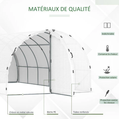 Cette grande serre de jardin tunnel vous aidera à protéger vos plantes contre les aléas climatiques et les oiseaux. Sa conception et fabrication avec des matériaux de qualité vous assureront un parfait rendement.