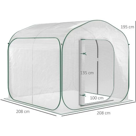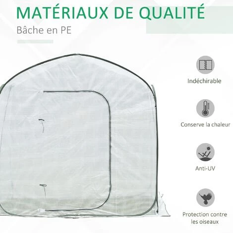 Cette serre pop-up d’Outsunny avec une apparence moderne et unique sera un choix parfait pour protéger vos plantes. Facile à ouvrir et ranger si besoin grâce à sa conception pop-up. Dotée d’une porte zippée favorisant une bonne ventilation et facilitant vos entrées et sorties. Vous pouvez mettre la serre dans le sac pour un rangement facile. Elle vous aidera à protéger vos plantes contre les aléas climatiques et les oiseaux et vous assurera un parfait rendement. Caractéristiques : – Serre pop-up de jardin très facile à installer et à ranger si besoin – Surface au sol de 4,32 m² idéale pour tout type de plantations : fleurs, légumes, fruits, etc… – Conception et fabrication de qualité en polyéthylène pour obtenir un rendement optimal (bâche rallongée de 8 cm vous permettant de l’enterrer dans le sol) – Châssis tubulaire robuste en acier époxy anticorrosion : usage pérenne – Protection assurée contre les aléas climatiques, les oiseaux, les rayons UV, etc… – Aération optimale possible grâce à sa grande porte zippée enroulable – Montage et démontage rapide et facile (sac de transport zippé inclus !) Spécifications : – Coloris : blanc, vert – Dim. totales : 208L x 208l x 195H cm – Dim. porte : 100l x 135H cm – Accessoires fournis : 14 piquets d’encrage au sol, 6 cordages – Réf. : 845-406