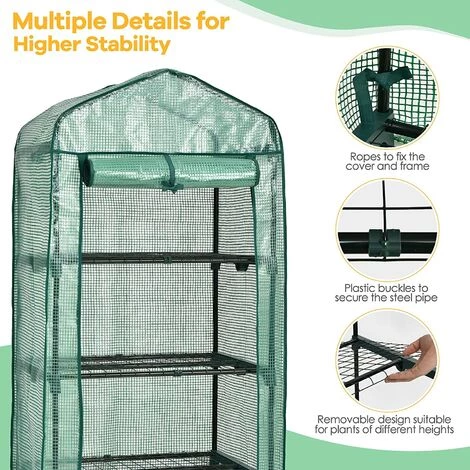 - ★BONNE STABILITÉ AVEC UN CADRE EN ACIER★Le cadre de la serre est en acier peint par poudrage, ce qui lui confère une bonne stabilité et une bonne résistance à la rouille, et chaque étagère peut supporter 15 kg. En outre, pour plus de stabilité, vous pouvez également presser des pierres contre le bas de la couverture.