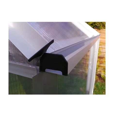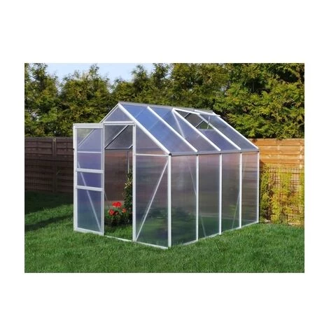 Serre en polycarbonate de 4 mm. Cette serre est équipée d’une porte coulissante et d’une lucarne. La serre comprend des gouttières intégrées. Les profilés en aluminium sont prédécoupés et pré percés, permettant un assemblage facile par boulons et écrous.