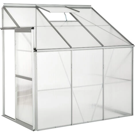 Serre de Jardin, Serre de Jardinage, Abri de Jardin Adossée 4,09 m³ en Aluminium 192 cm x 128 cm x 202 cm TECTAKE. • Cette serre de jardinage très pratique est idéale pour être adossée à votre maison, à un mur de votre jardin ou à une remise. • Plantez simplement vos légumes, vos fruits et vos herbes aromatiques et affranchissez-vous des contraintes de saison. • Notre abri de jardin offre une protection parfaite contre les conditions météorologiques. • Il protège efficacement vos cultures contre la pluie, le rayonnement extrême du soleil ou les dommages causés par les oiseaux. • La lucarne assure une bonne aération. • Le châssis résistant en aluminium anodisé, les plaques creuses résistantes aux UV et la lucarne de toit viennent parachever le profil de cette serre de qualité.