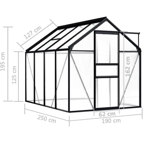 Cette serre spacieuse a une surface totale de 4,75 m². Elle peut accueillir un nombre considérable de plantes et sera une excellente solution pour protéger vos plantes du froid. Fabriquée en panneaux de polycarbonate, cette serre solide est résistante aux UV et isolée thermiquement. La serre a une construction en aluminium robuste et sans entretien pour plus de stabilité. Le système de gouttière permet efficacement l’évacuation de l’eau, et l’évent de toit assure une ventilation optimale par temps chaud. Les panneaux de toit sont fixés avec des clips métalliques, garantissant sa durabilité et son utilisation à long terme. Notre serre est facile à assembler. Veuillez noter que la fondation n’est pas incluse ; et le toit de notre serre ne peut pas supporter de fortes chutes de neige.